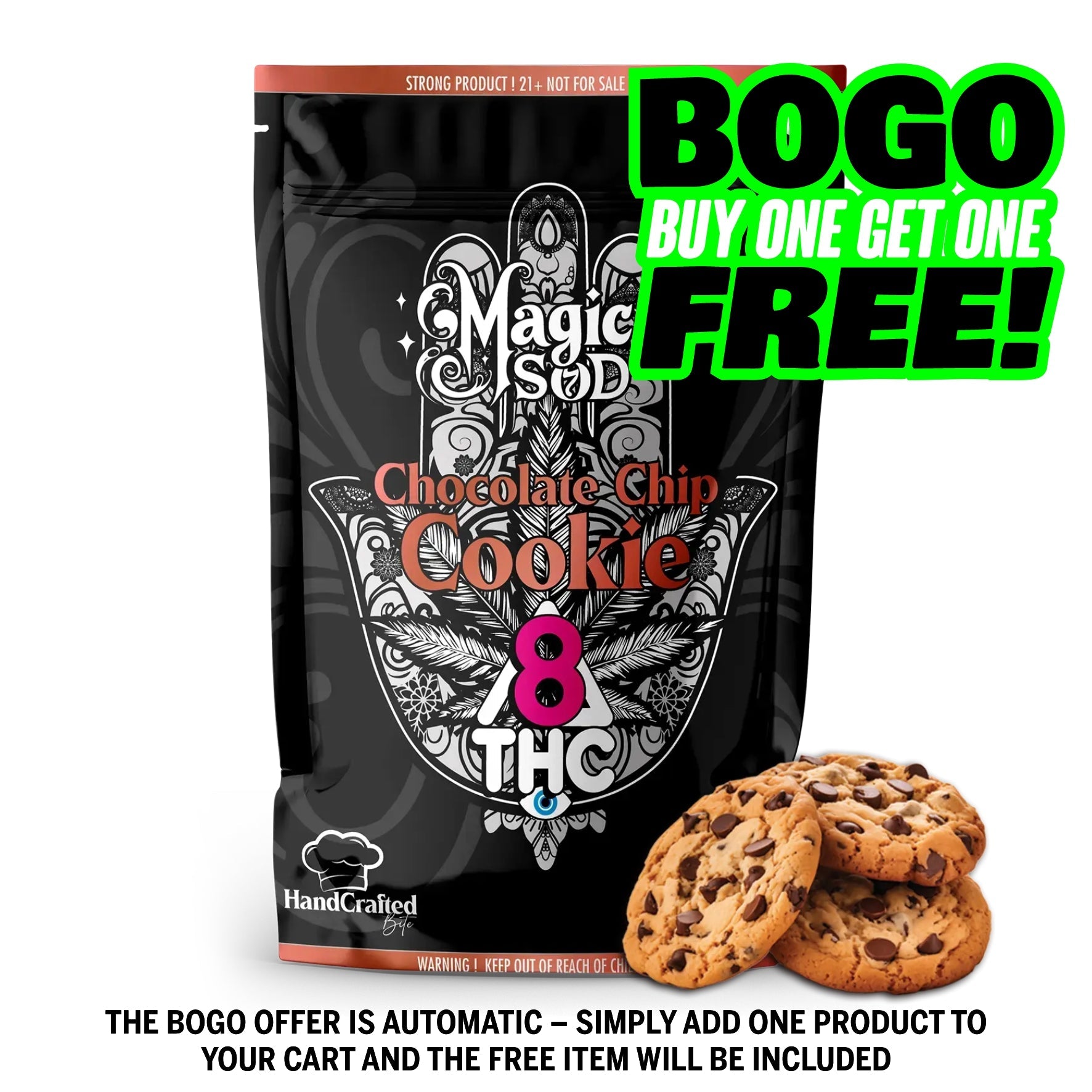 Crafted with premium ingredients and infused with Delta 8 THC, our Magic SOD Chocolate Chip Cookies offer a unique and enjoyable experience.